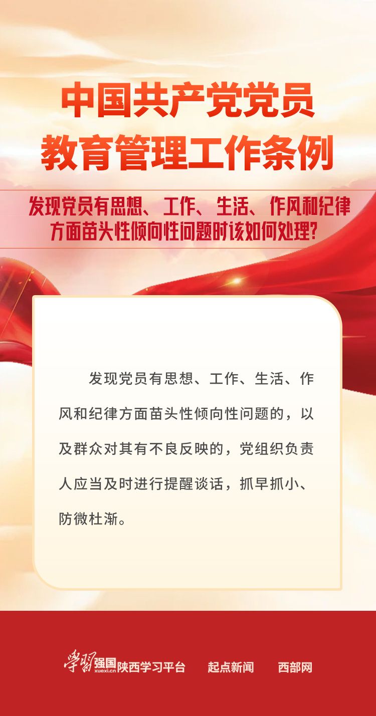 【学习卡片】《中国共产党党员教育管理工作条例》:发现党员有思想、工作、生活、作风和纪律方面苗头性倾向性问题时该如何处理?