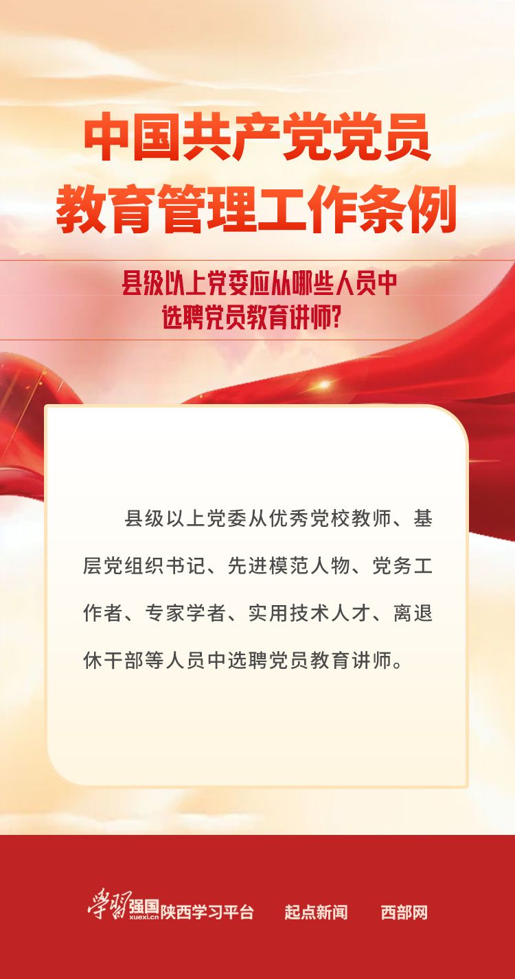 【学习卡片】《中国共产党党员教育管理工作条例》:县级以上党委应从哪些人员中选聘党员教育讲师?